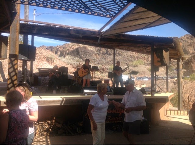 In the afternoon, we drove to the Desert Bar that we had heard about. A man bought some desolate desert land a few years ago and built this bar. There is no sign directing you to it; it is just word of mouth. We drove about 10 miles back on a "primitive" road. It was just a rocky path through the desert. Our top speed was 5 miles per hour. It is only open on weekends and closes at sunset, as it is totally run on solar. We were surprised at the number of people there.